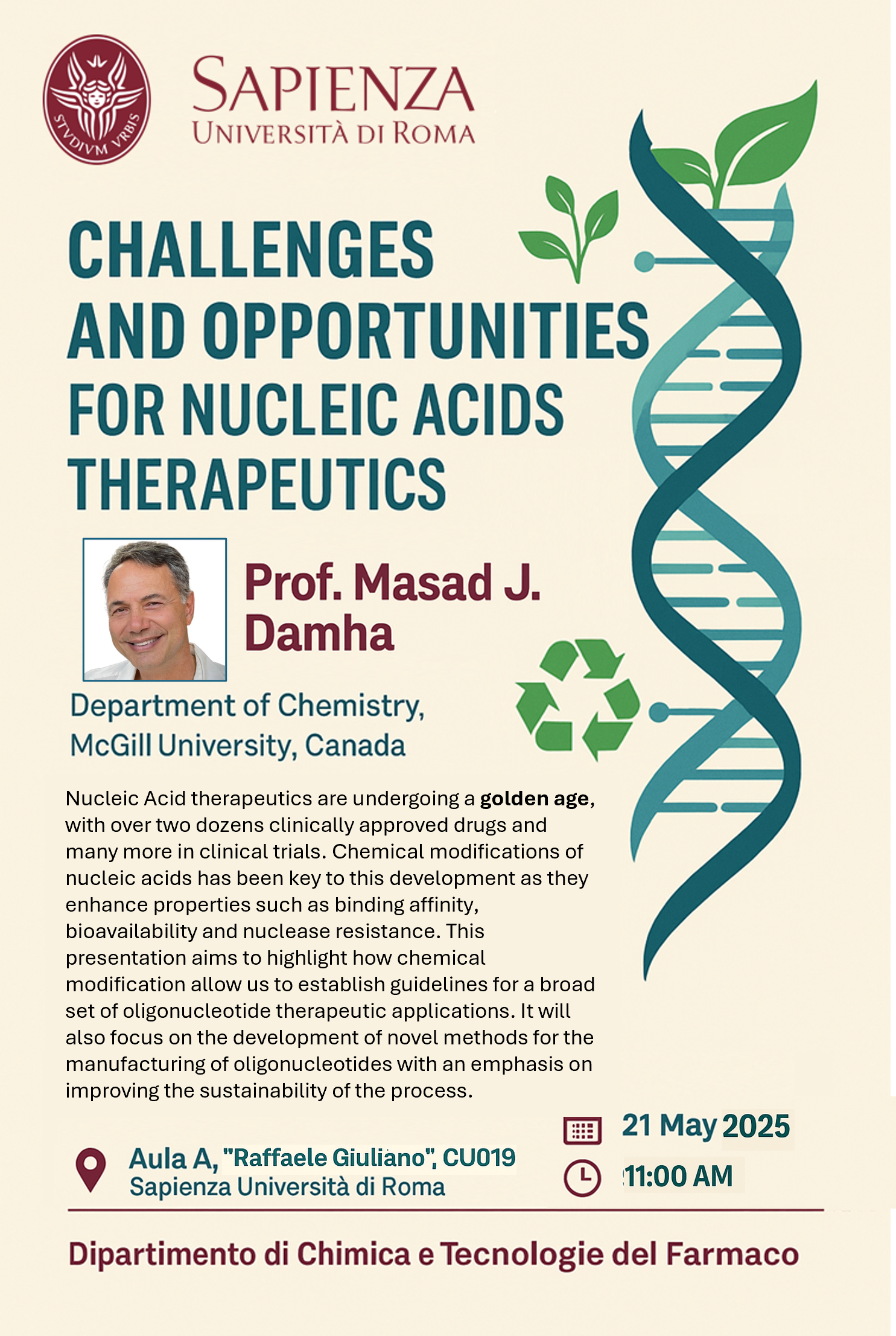 Il prossimo 21 maggio si terrà, alle ore 11.00 presso l'aula A "Raffaele Giuliano", il seminario del Prof.Masad J. Damha (McGill University - https://www.damha-group.mcgill.ca/damha.html), uno dei massimi esperti internazionali nel campo della sintesi e delle modifiche chimiche degli RNA terapeutici, dal titolo "Challenges and Opportunities for Nucleic Acids Therapeutics".